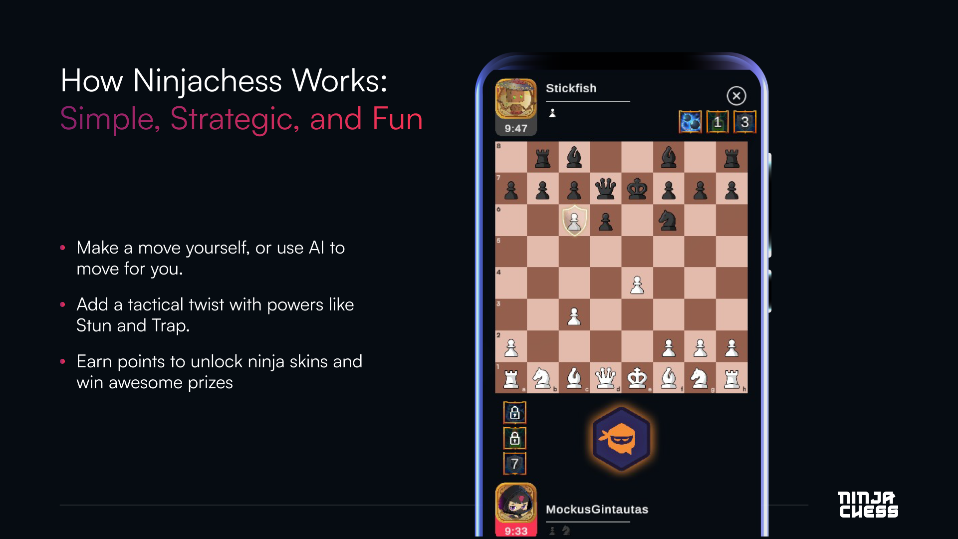 NinjaChess is a turn-based, strategic game that integrates the timeless rules of chess with specialized “ninja powers” and blockchain-based rewards.&#x20;